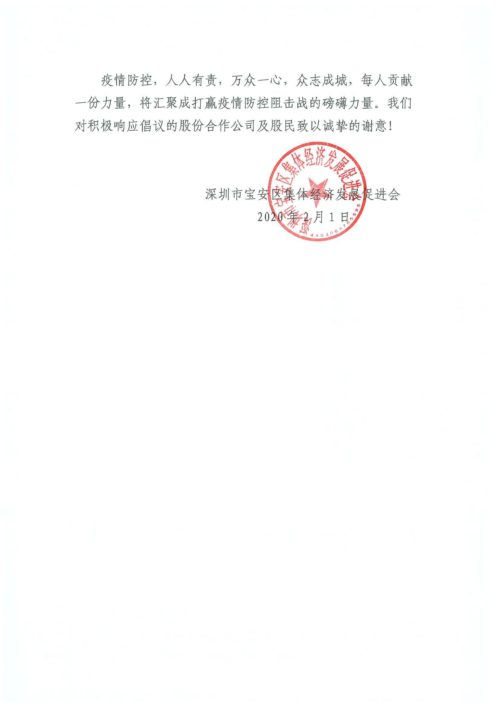 深圳新聞網(wǎng)寶安訊 “疫情防控,人人有責(zé),萬眾一心,眾志成城,每人貢獻(xiàn)一份力量,將匯聚成打贏疫情防控阻擊戰(zhàn)的磅礴力量?!?月1日晚,寶安區(qū)集體資產(chǎn)管理局指導(dǎo)寶安區(qū)集體經(jīng)濟(jì)發(fā)展促進(jìn)會(huì)向?qū)毎矃^(qū)各社區(qū)股份合作公司、全體股份合作公司股民發(fā)出《同心協(xié)力共克時(shí)艱適當(dāng)減免企業(yè)及來深務(wù)工人員租金的倡議書》,號召全區(qū)股份合作公司及股民適當(dāng)減免企業(yè)及來深務(wù)工人員15-30天租金及物業(yè)費(fèi),并根據(jù)疫情防控的需要可再次追加減免。