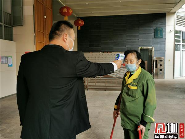 物業(yè)工作人員正在給保潔員測溫。