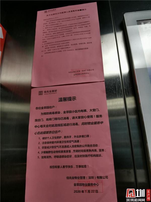 小區(qū)物業(yè)管理處主任鄒菊彬表示,目前小區(qū)每天進行3次全面消殺,包括地面、電梯、樓道等多個位置。他表示,小區(qū)內(nèi)已張貼《新型冠狀病毒感染的肺炎相關(guān)知識和個人防護》等防護指引和宣傳資料。物業(yè)工作人員向還未返深的住戶進行了宣傳解釋,消除恐慌。對返深的小區(qū)住戶已做好詳細信息登記,對居家醫(yī)學(xué)觀察的住戶每天兩次隨訪,并經(jīng)常給他們送一些生活用品。“我們的工作人員已經(jīng)把電話留給他們,有啥需要幫忙的可以隨時聯(lián)系”,他說到。