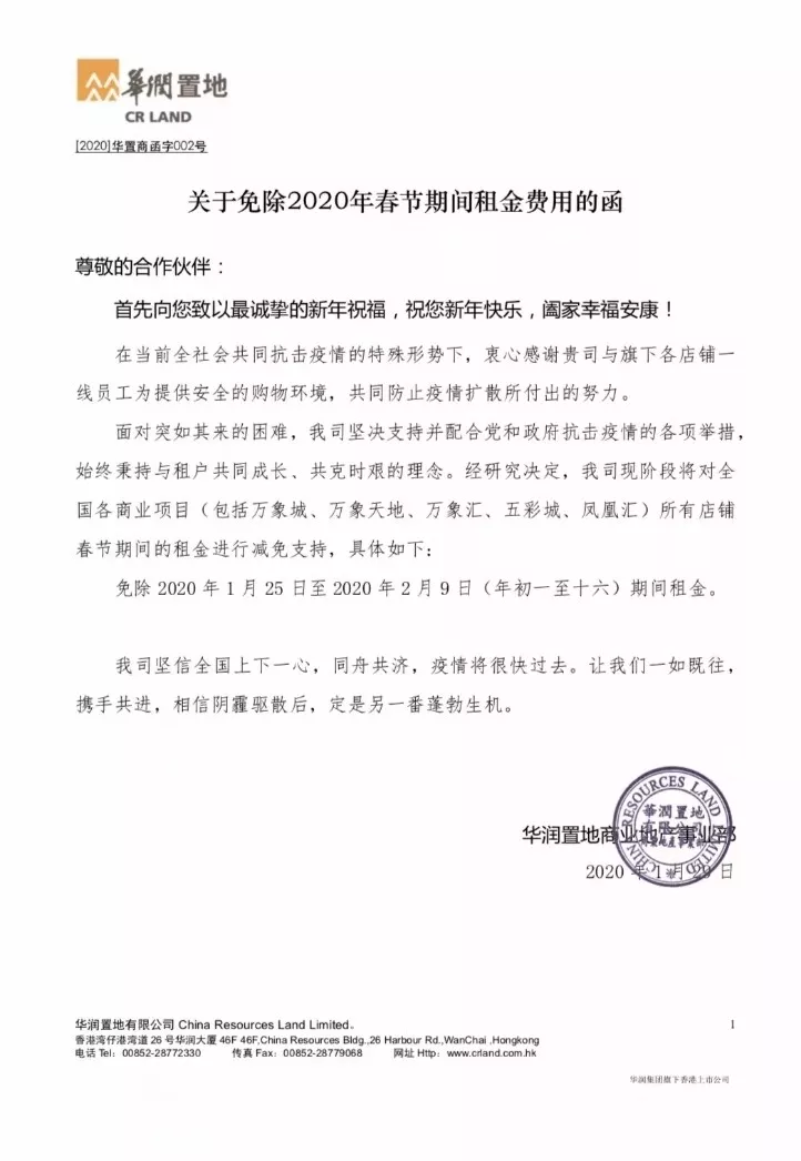 華潤(rùn)置地宣布免收1月25日—2月9日全國(guó)所有商業(yè)項(xiàng)目的租金,與商戶(hù)攜手共進(jìn)。