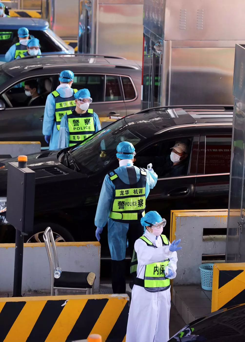 執(zhí)勤民警協(xié)助醫(yī)務(wù)人員對入深車輛上的人員進行體溫檢測。