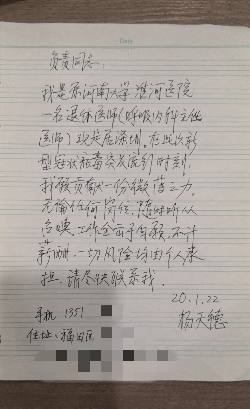 深圳新聞網(wǎng)2月4日訊(見圳客戶端、深圳新聞網(wǎng)記者 邱曉潔)1月23日,福田街道海濱社區(qū)工作站收到一封請(qǐng)?jiān)笗?,上面寫著:“我愿貢獻(xiàn)一份微薄之力,無論任何崗位,隨時(shí)聽從召喚,工作全出于自愿,不計(jì)薪酬,一切風(fēng)險(xiǎn)均由個(gè)人承擔(dān)。”在請(qǐng)?jiān)笗淖詈?,還附上了自己和愛人的聯(lián)系電話及住址。