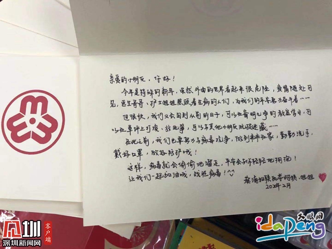 除了疫情防護(hù)的必需品,記者在這份暖心的“抗疫禮包”中還發(fā)現(xiàn)了一封字跡工整的信。信中寫道:親愛(ài)的小朋友,你好!今年是特殊的新年,雖然外面的世界看起來(lái)很危險(xiǎn),疫情隨處可見(jiàn),醫(yī)生哥哥、護(hù)士姐姐照顧著生病的人們,為我們的平安努力奮斗著,但很快,我們又會(huì)回到從前的日子……劉贊告訴記者,這些漂亮的字跡出自她的同事肖可之手,雖然沒(méi)能跟姐妹們一起慰問(wèn),但肖可還是希望能盡自己的一份力,讓這份禮包更加溫暖,讓孩子們更加快樂(lè)開(kāi)心。