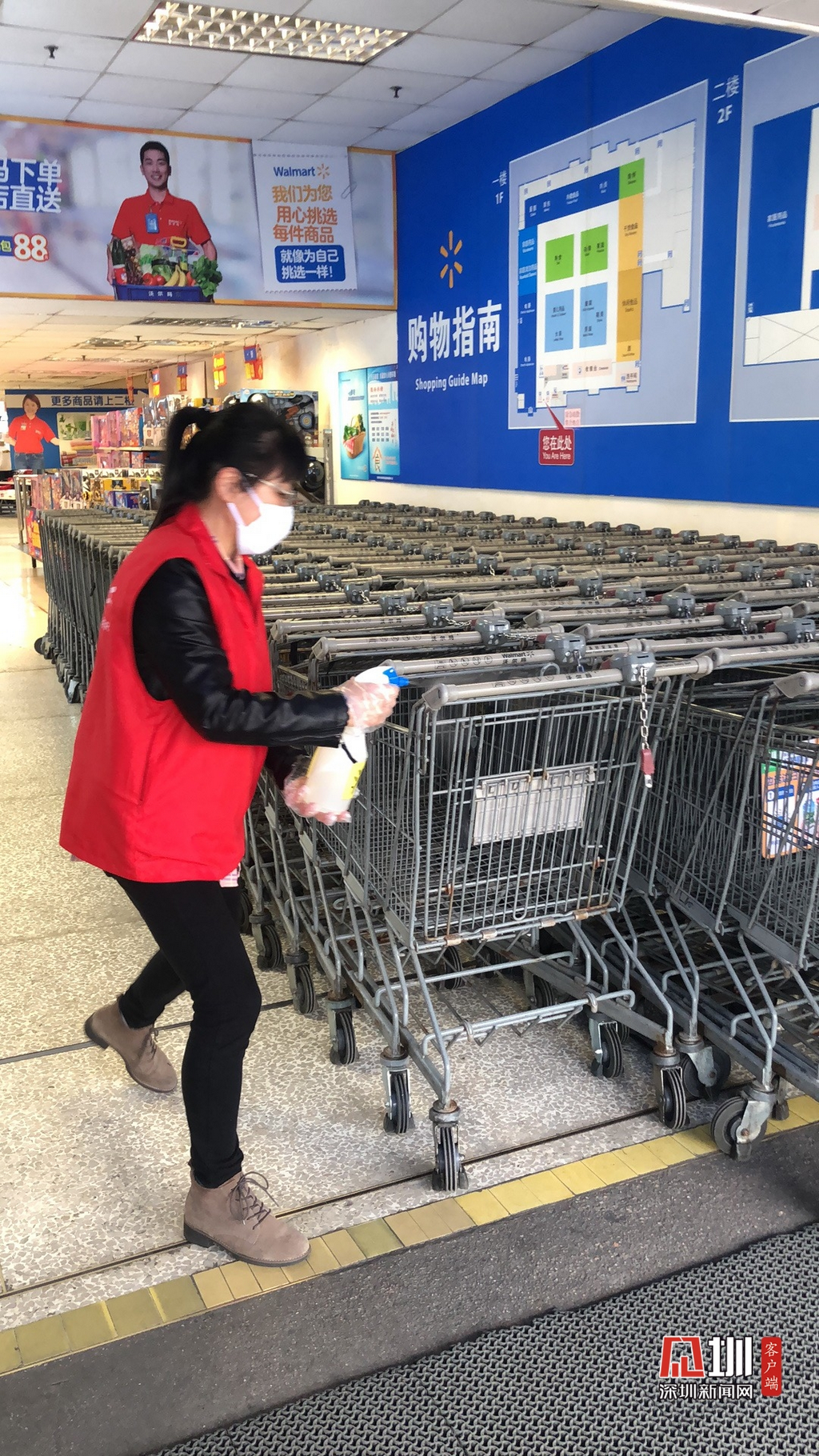 在消毒方面,景田北沃爾瑪超市每天對超市進行高頻次消毒,包括購物車、按鍵、門把手、出入口等人群經(jīng)常接觸的區(qū)域,并保持場所通風(fēng),增加空氣對流。