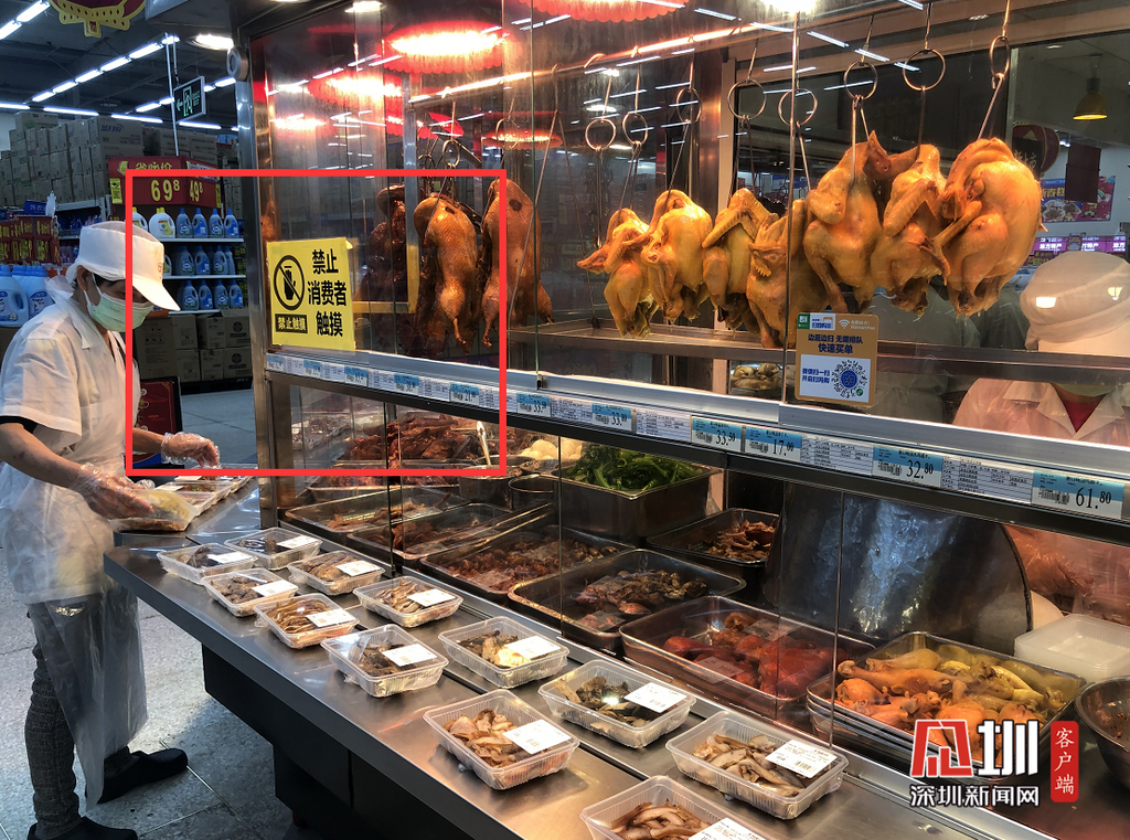 《公告》中提到,禁止商場、超市、糕點店、水果店提供食品“試吃”服務(wù)。記者看到,景田北沃爾瑪超市熟食區(qū)有明顯禁止消費者觸摸等標(biāo)志。“疫情防控期間,我們是禁止給市民提供試吃的?!蔽譅柆斚嚓P(guān)負責(zé)人說道。