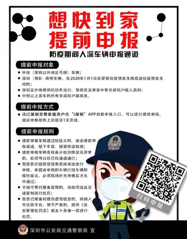 深圳交警提示,預計返深車流將逐漸增大,為了更快速的通過檢疫點,建議即將返深的車主和廣大市民提前通過網(wǎng)上進行申報。