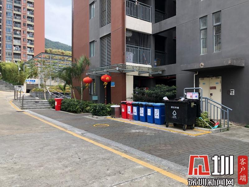 羅湖蓮馨家園小區(qū)的廢棄口罩回收桶與其他分類的垃圾回收桶分開擺放。
