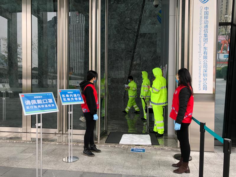 中國移動門口實行雙向體溫監(jiān)測,名單內(nèi)通行,名單外申請。