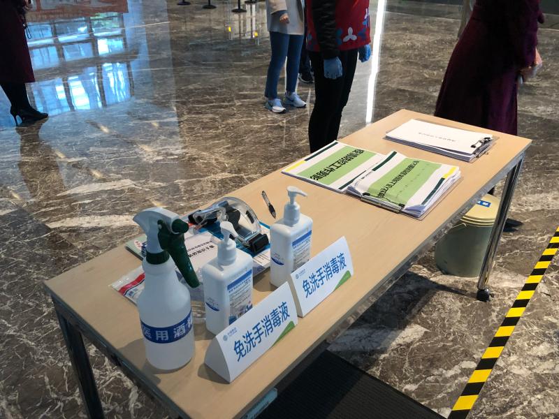 大堂門口放有免洗手消毒液、酒精等,進出人員需要進行登記。