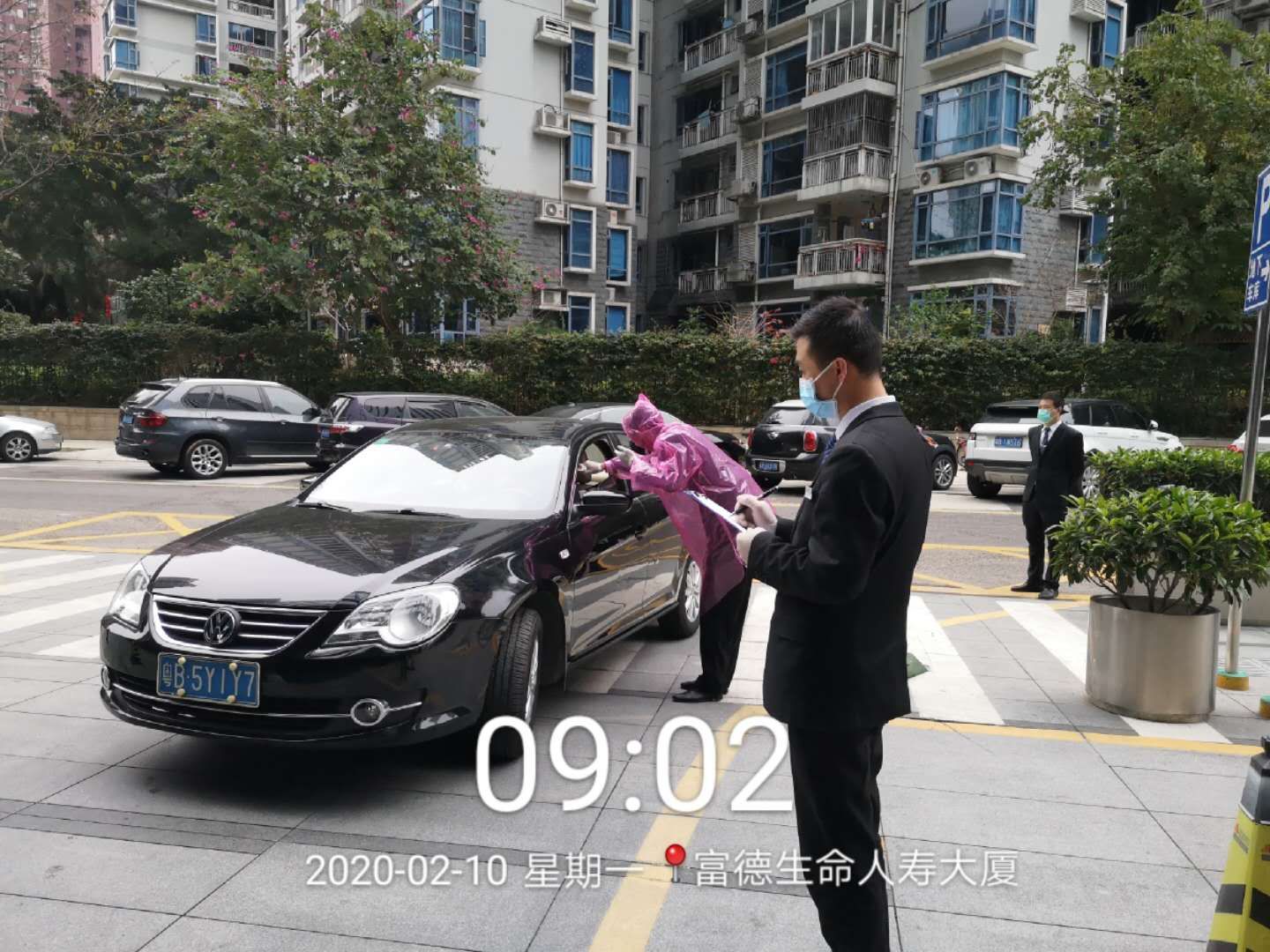 蓮花街道富德生命人壽大廈對進入園區(qū)車輛駕駛員及乘客進行體溫監(jiān)測及信息登記