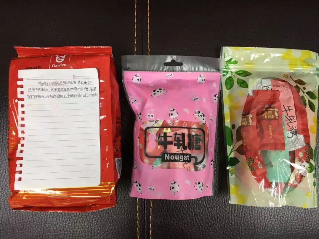 2月4日4時許,夜深人靜,深圳市公安局福田分局香蜜湖派出所收到了一份特殊的禮物:三袋還帶著余溫的暖心食品,還附著一張小紙條:“謝謝人民背后堅強的后盾,在疫情當下,還要辛苦值班,這是家里連夜做的牛軋?zhí)?,希望你們辛苦的工作中甜甜的。中國加油!武漢加油!”這名熱心市民表示,上一次到派出所求助的時候就是深夜凌晨4點鐘,知道派出所的同志深夜的時候仍在辛苦值班,所以剛剛在家里做好了牛扎糖就迫不及待地馬上送來,希望派出所的同志趁熱吃一點,暖暖身子。收到如此暖心的禮物,香蜜湖派出所對這位熱心市民表示衷心感謝!