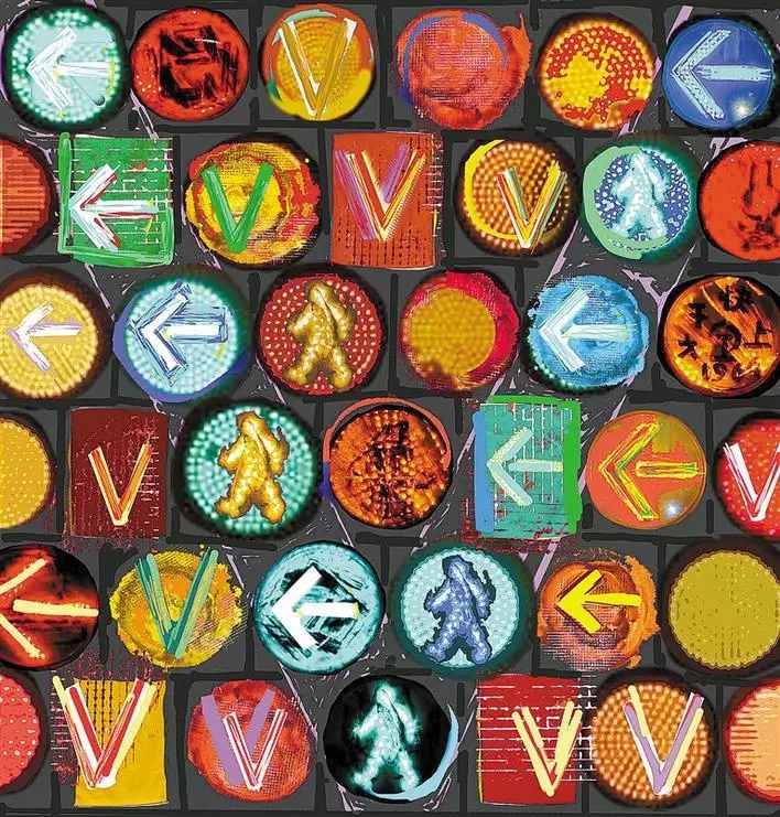 梁宇透露,這件作品的創(chuàng)作四易其稿,將信號燈所指代的“社會規(guī)則”加以排列強(qiáng)化,以此強(qiáng)調(diào)“秩序”本身在與疾病博弈混亂環(huán)境中的重要性。作品以濃烈的對比色彩、緊密排列的幾何圖形試圖傳達(dá)當(dāng)下人們的緊張情緒和焦慮心態(tài)。同時,信號燈中“行走”、“前進(jìn)”、“Victory”的提示標(biāo)識,被清晰地提煉出來,成為能讓畫面安定的因素,望帶給觀者一點思緒的寧靜與心靈的慰藉。