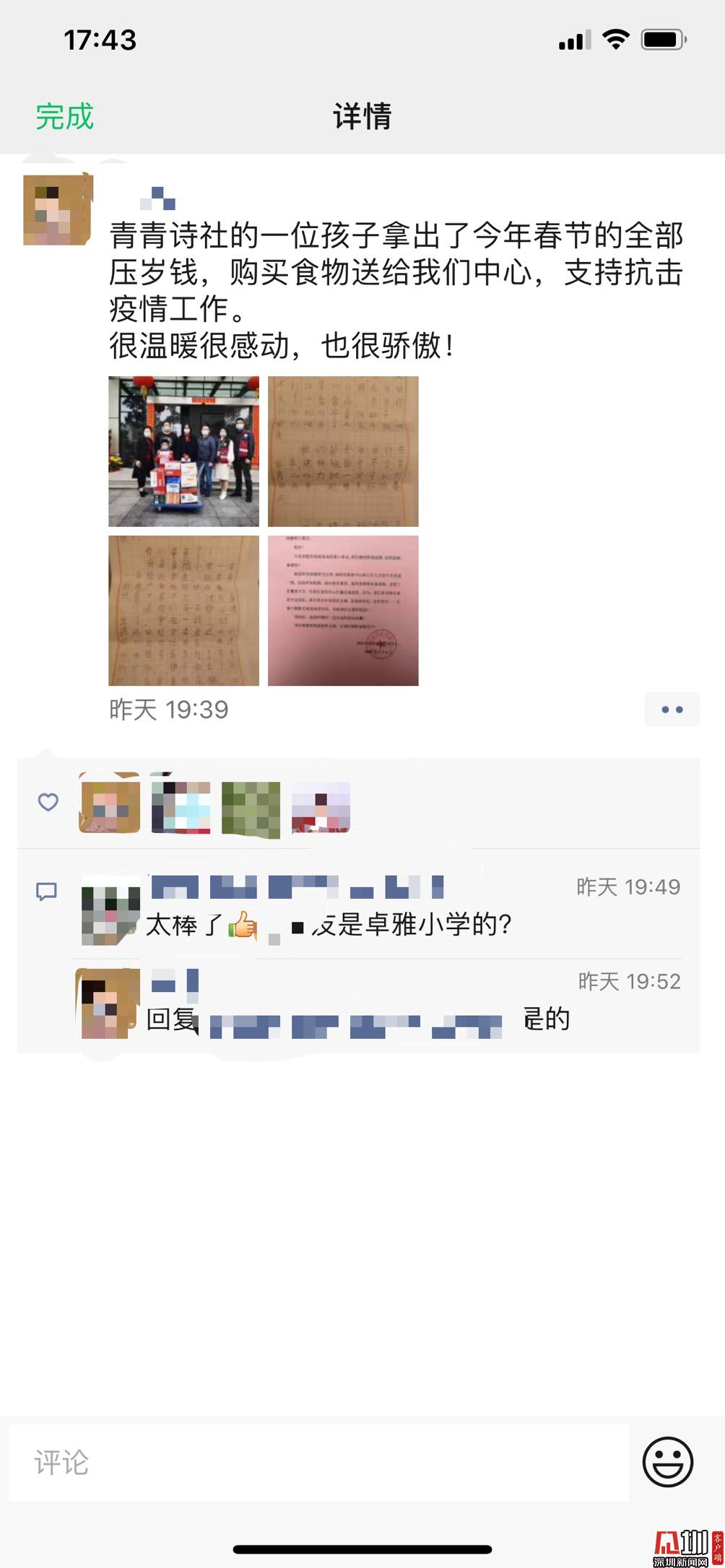 從與家人的密切交談中,他了解到防疫一線工作人員的辛苦,便主動(dòng)聯(lián)系了在深圳疾控中心工作的桃源青青詩社創(chuàng)始人王老師。因?yàn)橘I不到口罩,在王老師的建議下,張赫奕決定捐贈(zèng)食品給加班的工作人員補(bǔ)充營養(yǎng)。