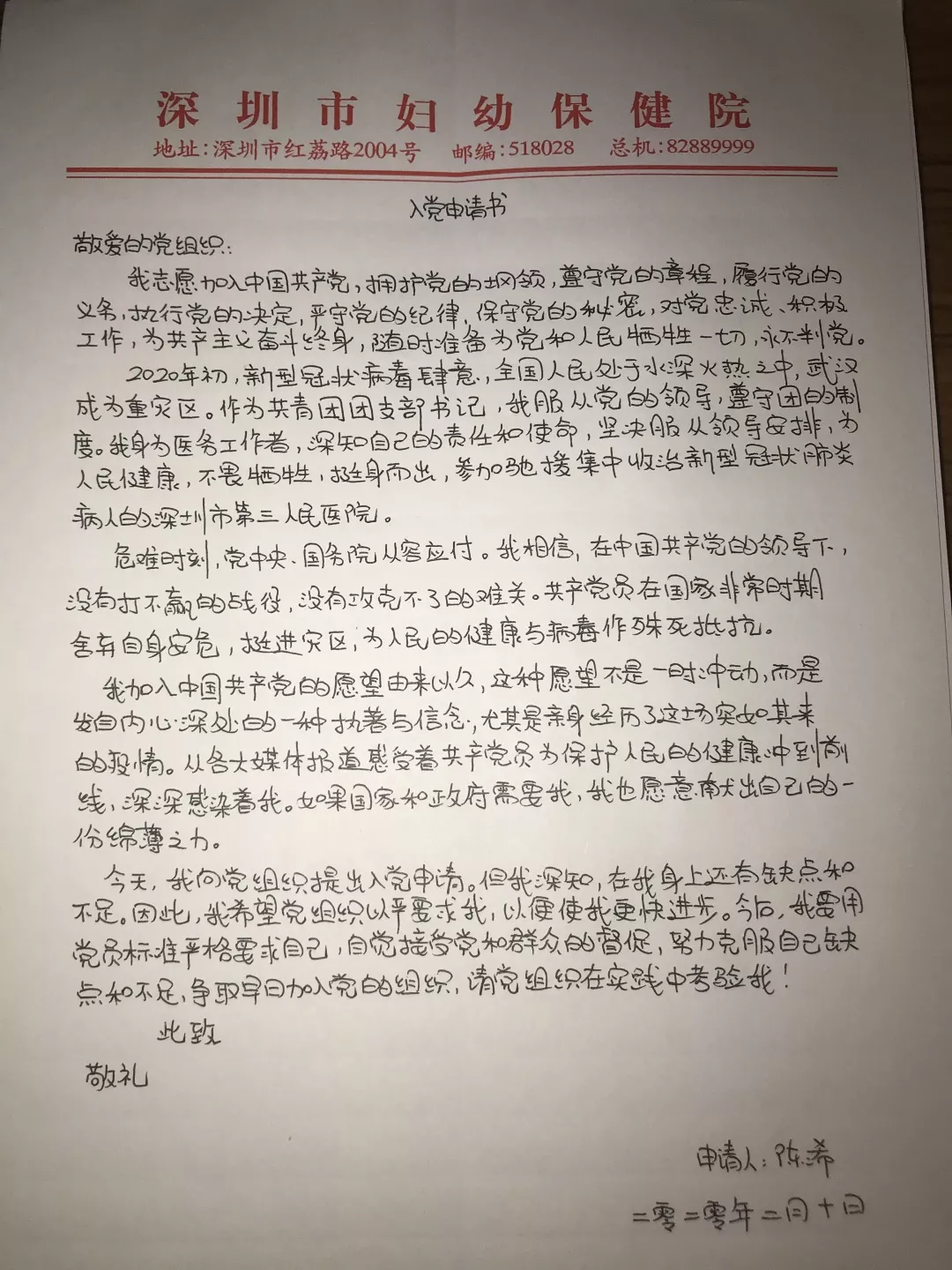 2月10日,陳浠在戰(zhàn)“疫”一線向組織提交了入黨申請書,她表示要以實際行動向身邊的共產(chǎn)黨員學(xué)習(xí),希望早日加入黨組織,在抗擊疫情的一線,在今后的每一天,充分發(fā)揮黨員的先鋒模范作用。
