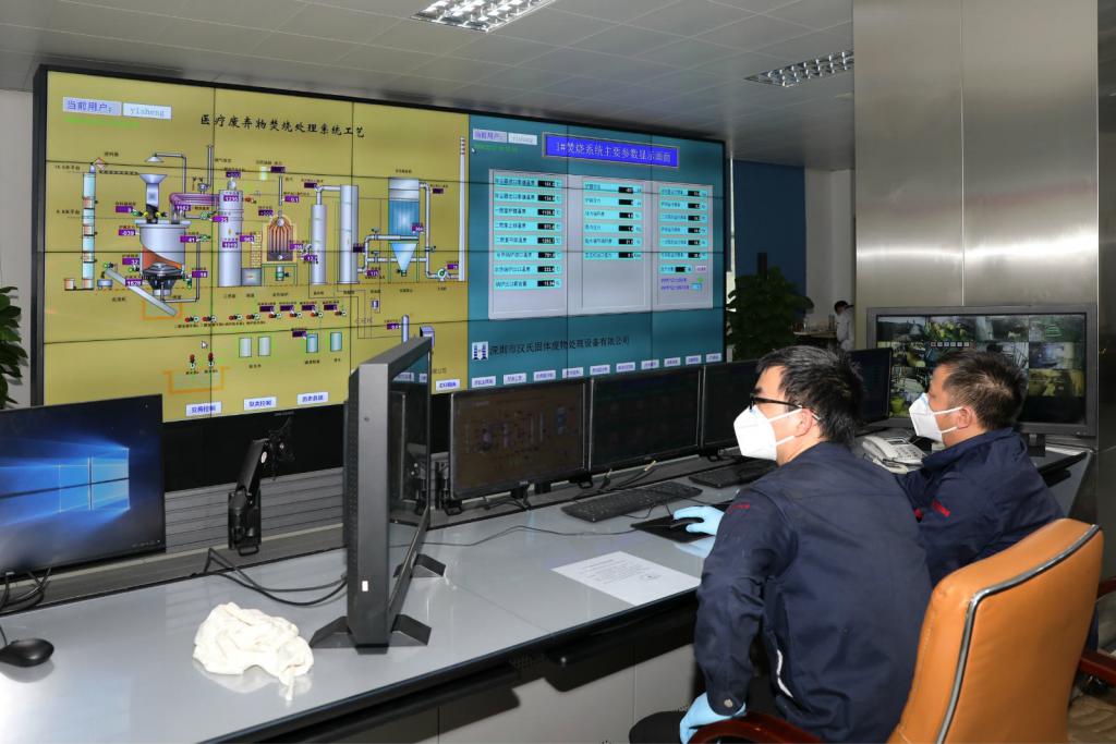 ▲工作人員通過實(shí)時(shí)影像監(jiān)測醫(yī)療廢物處置過程。