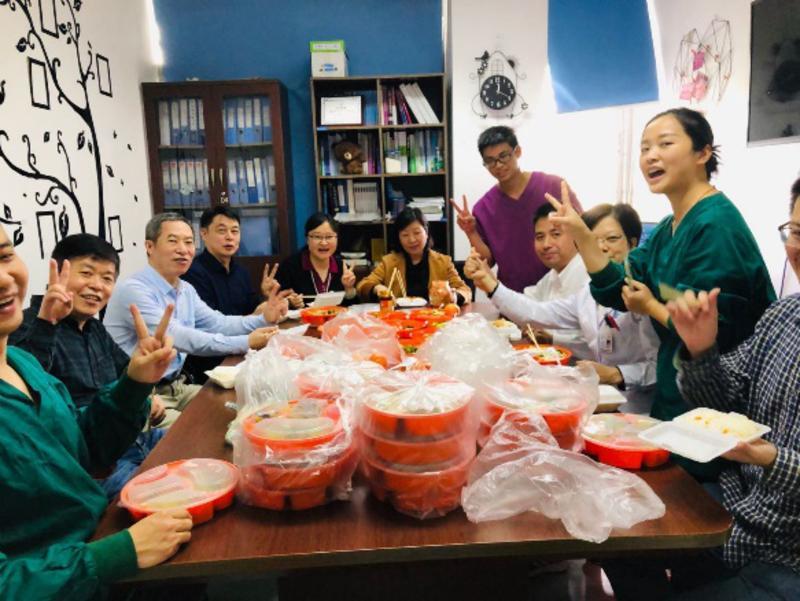 20:40,院領(lǐng)導(dǎo)和專家剛剛討論會(huì)診結(jié)束,病房同事也剛剛完成輪換交接。配餐室突然多了好多人,大家好像約好的似的,都不愿意回去自己過(guò)年。我們相聚一起,不分上下級(jí),我們只是一群同事(其實(shí),劉映霞副院長(zhǎng)也在)一起吃除夕工作餐,一起過(guò)大年。