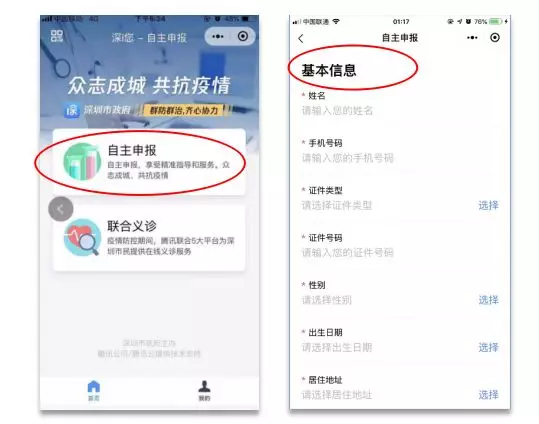 第一步:通過微信搜索“深i您-自主申報”小程序、i深圳公眾號-抗擊疫情-深i您自主申報、“i深圳”APP疫情防控服務專區(qū)入口等多途徑進入自主申報平臺,請根據(jù)實際情況填寫基本信息、人員類型、是否居家隔離、居住屬性、是否有如下癥狀、其他等信息,其中帶*號和有必選字樣的為必填項,請按照平臺提示填寫。