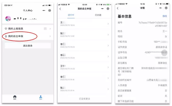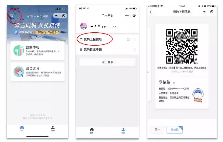 在進出小區(qū)時,可在“深i您-自主申報”小程序首頁點擊左上角“二維碼圖標”或前往“我的>個人中心”點擊“我的上報信息”向工作人員出示“深i您-自主申報”平臺生成的系統(tǒng)認證圖碼,憑該圖碼出入小區(qū),無需作重復申報。