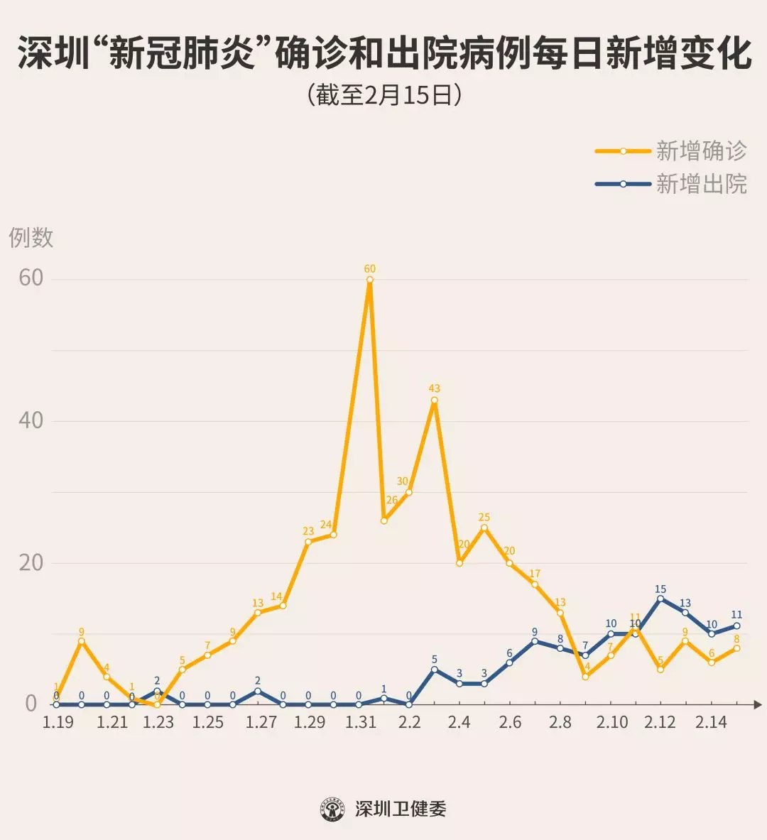 截至2月15日24時,深圳累計(jì)報(bào)告“新冠肺炎”確診病例414例。2月15日當(dāng)天全市新增確診病例8例(個案詳情今晚公布)。 ▲新增出院病例已超過新增確診病例 累計(jì)報(bào)告確診病例中,男性195例、女性219例。 按照病例管理地區(qū)劃分,南山區(qū)87例、福田區(qū)78例、龍崗區(qū)71例、寶安區(qū)62例、龍華區(qū)34例、羅湖區(qū)32例、光明區(qū)11例、坪山區(qū)7例、鹽田區(qū)6例、大鵬新區(qū)2例、其他(指由機(jī)場、車站、碼頭、關(guān)口、路卡等直接送往定點(diǎn)醫(yī)院的)24例。 目前,重癥29例、危重癥9例,無死亡病例,累計(jì)出院115例。 299例確診病例均在深圳市第三人民醫(yī)院隔離治療。 541例密切接觸者正在接受醫(yī)學(xué)觀察。 資料來源:深圳市疾控中心、深圳市衛(wèi)健委、廣東省衛(wèi)健委