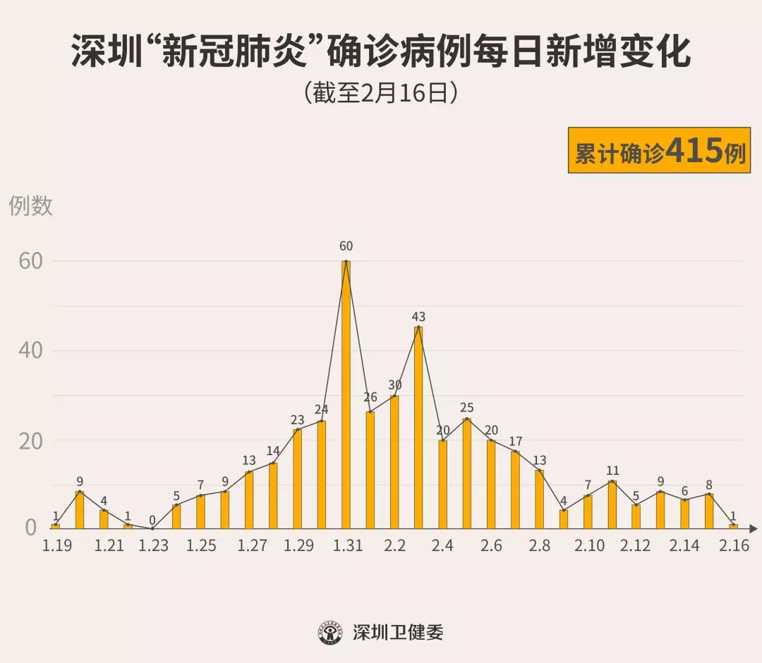 見圳客戶端·深圳新聞網(wǎng)2020年2月17日訊 據(jù)“深圳衛(wèi)健委”消息,截至2月16日24時,深圳累計報告“新冠肺炎”確診病例415例。2月16日當天全市新增確診病例1例,死亡2例。