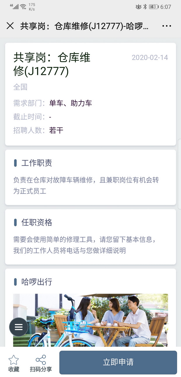 據(jù)了解,共享騎行的運維工作有非常大的靈活性:一、根據(jù)崗位職能的不同,運維每天的工作時間較靈活。如車輛調(diào)度人員,可以只在城市的上下班高峰期前后工作;二,工作形式上可以有比較大的靈活性。如哈啰的“單車獵人”,他的職能是在城市各個角落尋找因騎行超區(qū)失聯(lián)的單車、助力車;三,哈啰出行及哈啰的第三方人力公司,可以為這些崗位提供較為靈活的結(jié)薪方式,通過綠色通道可以做到按周或雙周結(jié)薪。待原崗用工恢復(fù),共享崗位員工可隨時返回。