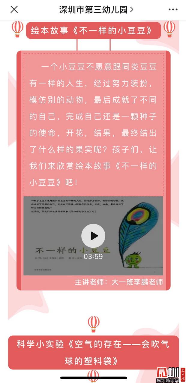 深圳市第三幼兒園園長邱雪華訴記者:“目前,三幼已經(jīng)開啟線上教學(xué)活動,我們充分運(yùn)用公眾號、微信群等網(wǎng)絡(luò)平臺,與家長、幼兒充分互動,陸續(xù)推出具有健康促進(jìn)特色的圖文推送,其中包括介紹防疫常識的攻略、由園長主講的園長電臺,還創(chuàng)辦了每日一期的原創(chuàng)系列游戲,以便家長在家也能獲取適宜的親子游戲活動資源。”記者在深圳市第三幼兒園的微信公眾平臺上看到,幼兒園線上互動內(nèi)容豐富,其中包括視頻繪本故事、科學(xué)小實驗以及親子體育游戲。每個版塊均由深圳市第三幼兒園老師們主講示范并錄制視頻,便于孩子及家長學(xué)習(xí)。