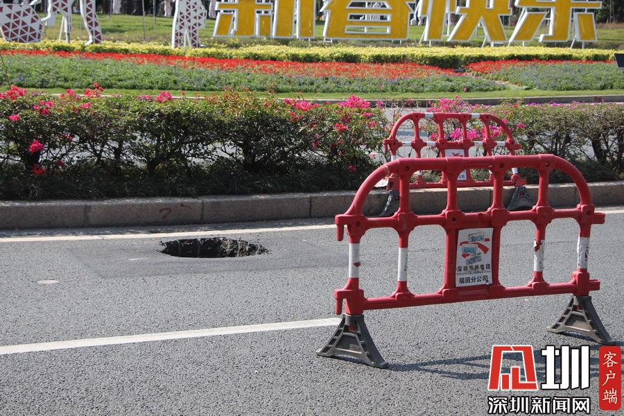 據(jù)市交通運輸局福田管理局的蔡警官介紹,18日上午9點40分,他在福田區(qū)深南大道輔導市民廣場路段例行巡邏時,發(fā)現(xiàn)路面有一塌陷的坑口,立即向上級匯報,并用鐵馬將洞口圍起來?!按蟾攀宸昼姾螅鱾€負責部門的工作人員就陸續(xù)到場了,期間也沒有造成什么交通意外?!?/span>