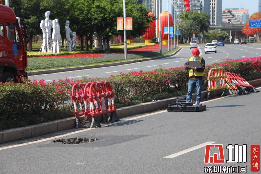 上午10點40分,記者在現(xiàn)場看到,該路面有一個直徑約一米、深約一米的坑口,旁邊還有一道長約20米的裂痕。工作人員正在使用雷達儀器對地面情況進行勘測,同時該路段及靠深南大道一條車道已暫時被封鎖,福田區(qū)交警大隊也在現(xiàn)場指揮交通。據(jù)悉,該位置較臨近的地鐵2、3路線的站點,一位深圳地鐵的工作人員告訴記者,目前該事故沒有對其線路運行造成影響,也非先前修挖地鐵所致。