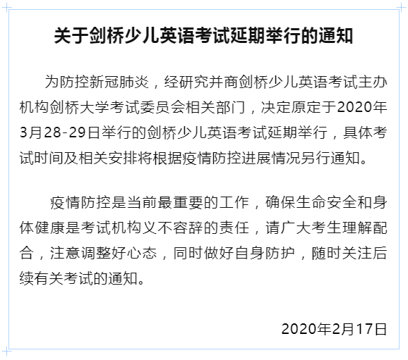 為貫徹落實(shí)國家和我省對新型冠狀病毒感染的肺炎疫情防控有關(guān)工作的部署和要求,切實(shí)保障廣大考生和考試工作人員生命安全和身體健康,經(jīng)研究決定,推遲原定于3月7-8日舉行的普通高考英語聽說考試和本科插班生考試(含三二分段專升本轉(zhuǎn)段考試)。具體時(shí)間安排視疫情控制情況另行通知。