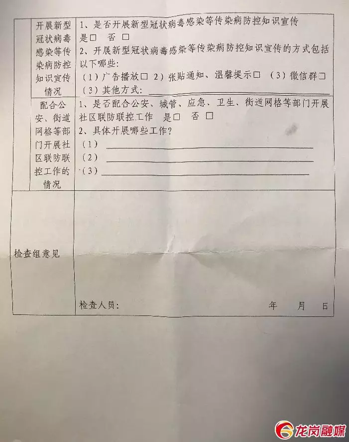 A:區(qū)住建局11組檢查人員都手握一張《龍崗區(qū)物業(yè)服務(wù)企業(yè)新型冠狀病毒防控工作檢查表》,其中按照“物業(yè)服務(wù)企業(yè)對(duì)企業(yè)從業(yè)人員的疫情防控情況”“口罩、手套等一次性衛(wèi)生用品專(zhuān)用垃圾桶的設(shè)置情況”“物業(yè)服務(wù)企業(yè)防疫責(zé)任落實(shí)情況”“開(kāi)展新型冠狀病毒感染等傳染病防控知識(shí)宣傳情況”“配合公安、街道網(wǎng)格等部門(mén)開(kāi)展社區(qū)聯(lián)防聯(lián)控工作情況”等五大類(lèi)17條檢查內(nèi)容展開(kāi)檢查,視情況評(píng)定“紅榜”或“黑榜”。