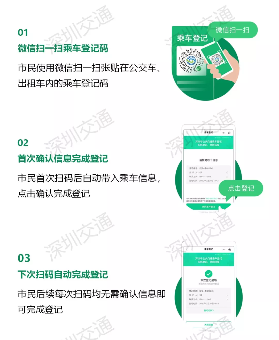 回答:深圳搭乘公交、出租車的市民請(qǐng)主動(dòng)進(jìn)行乘車登記。同時(shí),司乘人員也需每日進(jìn)行乘車登記。