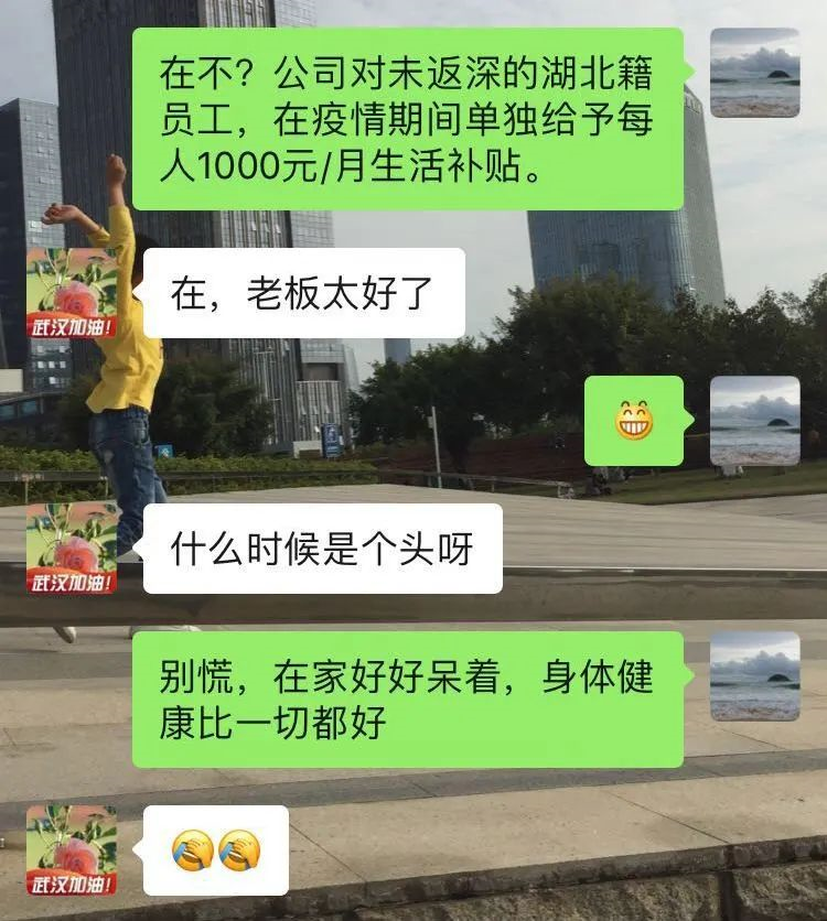 “工資已經(jīng)全額到賬,由于疫情影響,針對(duì)不能返程的湖北籍員工,每人額外發(fā)放1000元生活補(bǔ)貼?!?月17日,身在湖北公安的晏君收到公司通知后,懸著的心終于放了下來(lái)。晏君是深圳坤弘印務(wù)有限公司倉(cāng)儲(chǔ)部記賬員,她坦言,公司發(fā)放的工資和生活補(bǔ)助是“雪中送炭”,過(guò)去近一個(gè)月心里確實(shí)很忐忑,既擔(dān)心沒(méi)工資發(fā),又害怕丟了工作,如今不用擔(dān)心經(jīng)濟(jì)來(lái)源了?!瓣P(guān)鍵時(shí)候,公司不僅沒(méi)有拋棄我們,還給我們諸多關(guān)愛(ài)。我發(fā)現(xiàn)我更愛(ài)公司、更愛(ài)我的工作了?!?/p>
