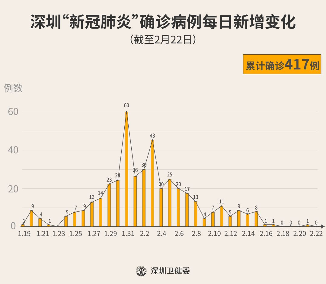 截至2月22日24時(shí),深圳累計(jì)報(bào)告“新冠肺炎”確診病例417例。2月22日當(dāng)天全市無新增確診病例,新增死亡病例1例。