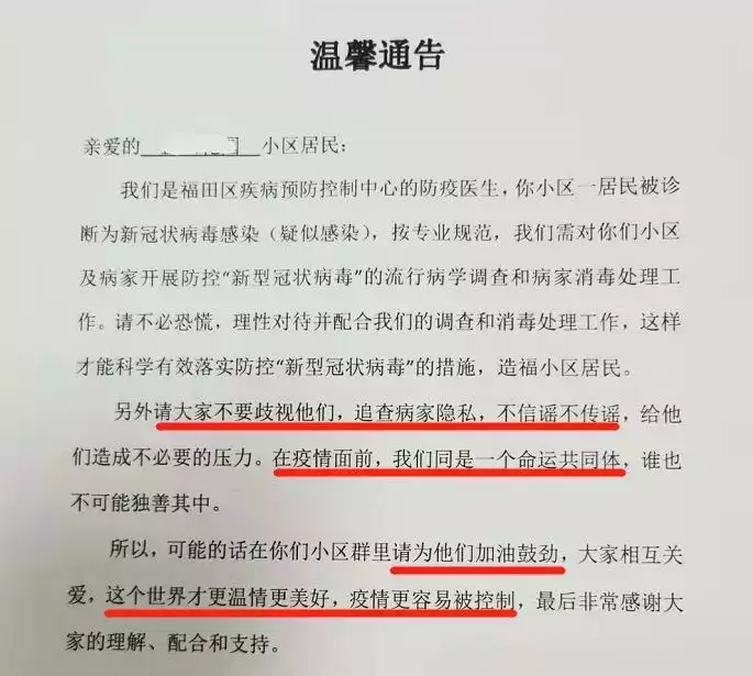 “疫情面前,我們同是一個(gè)命運(yùn)共同體”“大家相互關(guān)愛,這個(gè)世界才更溫情美好,疫情更容易被控制……”1月30日,位于深圳福田區(qū)的一小區(qū)出現(xiàn)新冠肺炎疑似感染病例,福田區(qū)疾病預(yù)防控制中心的防疫醫(yī)生隨即發(fā)布了這則通告,瞬間刷屏了深圳人的朋友圈。通告除了呼吁小區(qū)居民配合調(diào)查及消毒處理工作外,還特地懇請(qǐng)大家“不要歧視,在疫情面前,我們是同一個(gè)命運(yùn)共同體,誰也不可能獨(dú)善其身。”寥寥數(shù)字的“請(qǐng)求”,感動(dòng)無數(shù)人。