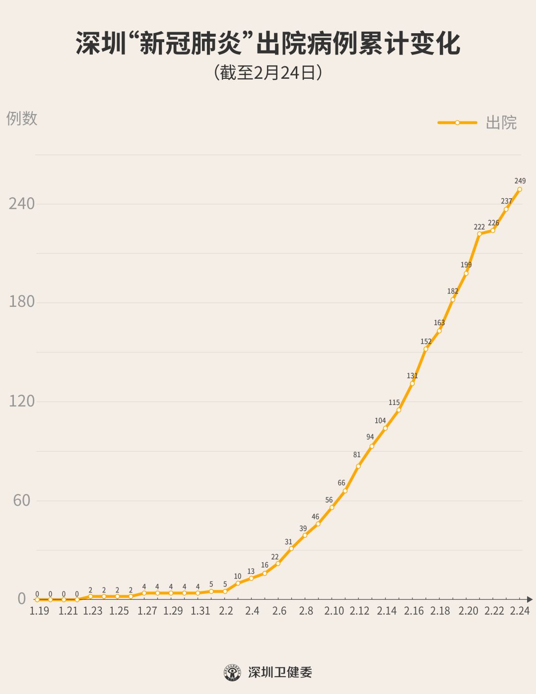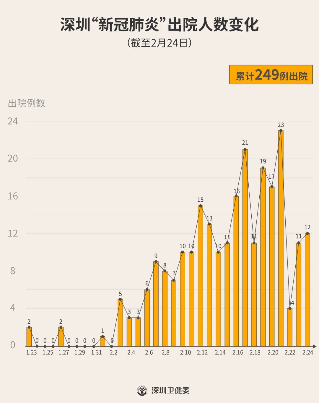 2月24日下午,經(jīng)專家組會診,深圳有12名新型冠狀病毒肺炎確診患者出院,累計達(dá)249人,連續(xù)22天有人出院。