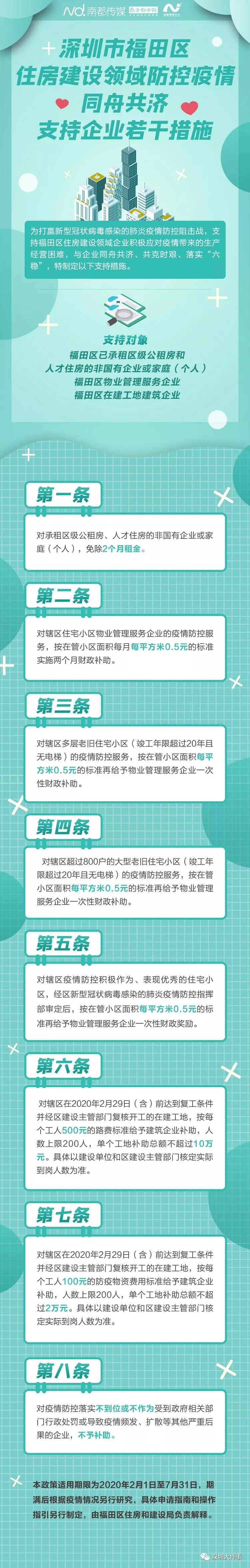 自深圳發(fā)布16條措施支持企業(yè)后,2月18日,福田區(qū)住房和建設(shè)局印發(fā)《深圳市福田區(qū)住房建設(shè)領(lǐng)域防控疫情同舟共濟(jì)支持企業(yè)若干措施》(下稱《福田住建支持企業(yè)措施》)的通知,推出8條支持措施,以支持福田區(qū)住房建設(shè)領(lǐng)域企業(yè)積極應(yīng)對(duì)疫情帶來的生產(chǎn)經(jīng)營(yíng)困難。