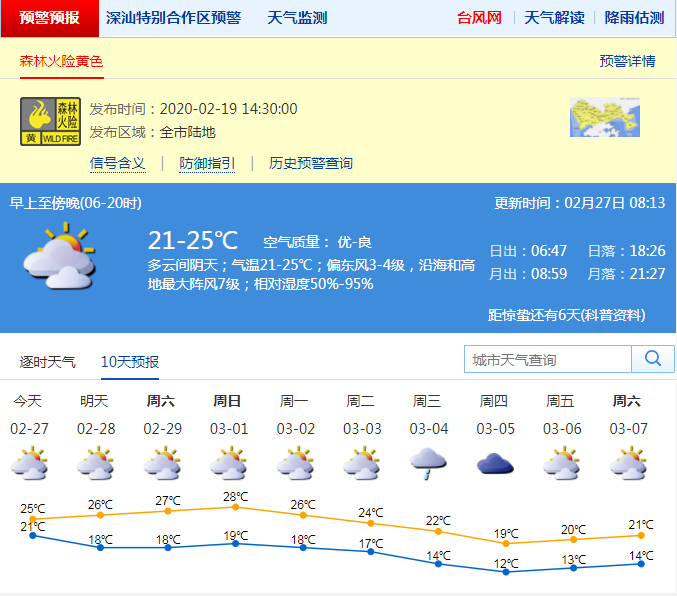 27日多云,早晨有輕霧,氣溫18-25℃,沿海及高地最大陣風(fēng)6-7級;28日至3月3日多云為主,氣溫小幅波動,早晚有輕霧,偶有零星小雨;4日冷空氣影響,北風(fēng)加大,有小雨,氣溫明顯下降。森林火險(xiǎn)黃色預(yù)警持續(xù)生效中,請注意家庭用火、用電安全。