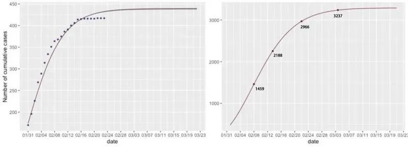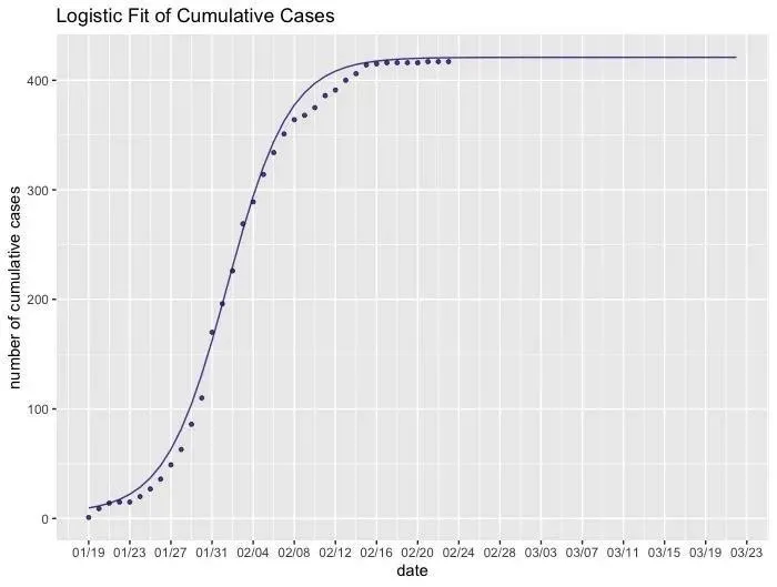 進(jìn)一步地擬合深圳新冠肺炎的累計確診人數(shù),并對累計確診人數(shù)做出預(yù)測??梢钥吹剑P皖A(yù)測自2月28日起病例數(shù)不再增加,預(yù)測得到最終的累計確診人數(shù)收斂在422人左右。
