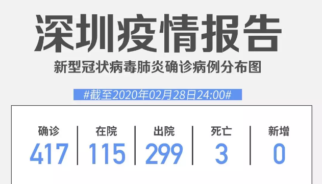 截至2月29日24時(shí),深圳累計(jì)報(bào)告“新冠肺炎”確診病例417例。2月29日當(dāng)天全市無新增確診病例,當(dāng)天出院病例9例(從26日起不再公布出院個(gè)案)。