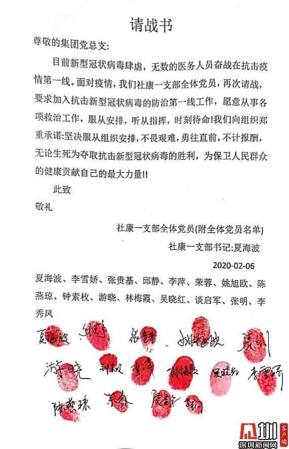 見圳客戶端·深圳新聞網(wǎng)訊(記者 董非)“讓黨旗在防控斗爭第一線高高飄揚?!毙鹿诜窝滓咔榘l(fā)生以來,南山區(qū)醫(yī)療集團總部黨員勇當先鋒,以實際行動踐行初心使命,涌現(xiàn)出眾多感人故事,展現(xiàn)了共產(chǎn)黨員的風(fēng)采與擔(dān)當。 疫情發(fā)生后,南山區(qū)第一時間制定出臺了《黨建引領(lǐng)疫情防控工作五項行動方案》,南山區(qū)委書記王強號召全體黨員,發(fā)揮黨組織的戰(zhàn)斗堡壘作用和黨員的先鋒模范作用,全力保障人民群眾生命安全和身體健康,讓黨旗在防控疫情斗爭第一線高高飄揚,堅決打贏疫情防控人民戰(zhàn)爭、總體戰(zhàn)、阻擊戰(zhàn)。南山區(qū)醫(yī)療集團總部積極響應(yīng),黨建引領(lǐng)下的防控抗疫工作有序科學(xué)地展開。 今年1月底,深圳市南山區(qū)區(qū)委授旗成立南山醫(yī)療系統(tǒng)黨員突擊隊。南山區(qū)醫(yī)療集團總部緊急組建了防控新冠肺炎應(yīng)急突擊隊,僅一天內(nèi)區(qū)醫(yī)療集團就共有169人完成第一批應(yīng)急突擊隊報名,其中黨員過半數(shù)。 疾風(fēng)知勁草,烈火煉真金。一封封請戰(zhàn)書閃電匯聚到黨總支,召即來,來能戰(zhàn),戰(zhàn)能勝,沖鋒在前就是擔(dān)當?shù)淖蠲姥堇[;一位位黨員迅速入隊黨員突擊隊,他們重溫入黨誓言,在黨旗下實踐著醫(yī)者仁心、人間大愛;一份份入黨申請書紛沓而來,特殊時期經(jīng)受特殊考驗,一批優(yōu)秀的醫(yī)護人員頁主動向黨組織靠攏。鏗鏘的語言、堅定的決心、舍我的擔(dān)當,是南山區(qū)醫(yī)療集團總部廣大黨員逆行而上、抗擊疫情的堅定決心和必勝信心。 最美逆行黨支部,積極請戰(zhàn)敢擔(dān)當 “我是共產(chǎn)黨員,我請戰(zhàn)!愿為戰(zhàn)勝疫情全力以赴!”這是南山區(qū)醫(yī)療集團總部一支部13名黨員和2名入黨積極分子聯(lián)名撰寫的《請戰(zhàn)書》(節(jié)選)。 面對新冠肺炎疫情,一支部黨員在夏海波支部書記夏海波的帶領(lǐng)下,在發(fā)熱門診、發(fā)熱患者預(yù)檢分診、社區(qū)“三位一體”排查等工作中,積極發(fā)揮共產(chǎn)黨員戰(zhàn)斗在一線、沖鋒在一線的模范帶頭作用,為戰(zhàn)勝新冠肺炎疫情全體黨員積極主動請戰(zhàn),并向集團黨總支遞交了請戰(zhàn)書。 社康一支部全體黨員的請戰(zhàn)書 一個個紅手印,令人淚目,彰顯著南山區(qū)醫(yī)療集團總部白衣天使們逆行而上的使命擔(dān)當和責(zé)任意識。 一支部書記夏海波說,“成為疫情防控工作第一線發(fā)展黨員,是面對疫情充分發(fā)揮黨員先鋒作用的具體實踐。此次請戰(zhàn),將更加激勵他們我們在今后的工作特別是近期防疫防控工作中,以黨員的標準嚴格要求自己,發(fā)揮黨員先鋒模范作用。同時,也會對全院全體員工產(chǎn)生積極引領(lǐng)、鼓舞作用,以更飽滿的斗志投入防疫防控工作?!?/p> 老黨員重溫入黨誓詞,面對黨旗表決心 “我宣誓:我志愿加入中國共產(chǎn)黨……”這是一次特別的宣誓。接到組織號召后,社康二支部的老黨員鐘達宏和吳麗娉,對著黨旗,以重溫入黨誓詞的方式,不忘黨員初心,牢記使命,積極沖鋒在前,誓要打贏防控狙擊戰(zhàn)。 社康二支部的老黨員鐘達宏和吳麗娉,對著黨旗,重溫入黨誓詞,誓要打贏防控狙擊戰(zhàn) 面對來勢洶洶的疫情,南山區(qū)醫(yī)療集團總部的黨組織和黨員干部不但沒有被嚇倒,反而激起了他們昂揚的戰(zhàn)斗意志和飽滿的工作熱情。 “我宣誓,我自愿加入抗擊新型冠狀病毒肺炎疫情防控工作隊伍,責(zé)任上肩,聽黨指揮,服從命令,科學(xué)應(yīng)對,恪盡職守,努力守護轄區(qū)居民健康,堅決打贏疫情防控攻堅戰(zhàn)!”守土有責(zé)、守土擔(dān)責(zé)、守土盡責(zé),所有社康中心的黨員干部將筑牢抗疫的基層防線,誓要守護轄區(qū)居民的生命健康。 社康二支部黨員在黨旗下宣誓努力守護轄區(qū)居民健康 艱難時刻主動請戰(zhàn),夫妻雙雙奮戰(zhàn)一線 1月26日,南山區(qū)醫(yī)療集團總部下發(fā)關(guān)于組建防控新型冠狀病毒感染肺炎應(yīng)急突擊隊報名的通知。除了得到集團黨員們的積極響應(yīng)之外,各個支部涌現(xiàn)出一波遞交入黨申請書的小高潮。 李婧是社康支部的一名全科醫(yī)生,一直在社康醫(yī)院中心從事全科醫(yī)療工作,戰(zhàn)“疫”的號角吹響,李婧第一時間參戰(zhàn),在所有抗疫時期入黨人員里第一個遞交了手寫入黨申請書。 李婧醫(yī)生的手寫入黨申請書 起初,她所在的蔚藍海岸社康中心考慮到李婧的愛人是深圳市公立醫(yī)院急診科醫(yī)生其愛人是深圳市某公立醫(yī)院的急診科醫(yī)生,疫情發(fā)生以來一直堅守在崗位上,家中尚有1歲零3個月的寶寶,就沒有讓她參加社區(qū)“三位一體”排查和酒店留守值班等一線工作和醫(yī)學(xué)觀察點留守值班等一線工作。李婧得知后,她主動提交請戰(zhàn)書、舍小家顧大家,并沒有因為生活上的困難而有所退縮,主動要求參與疫情排查一線工作。李婧夫妻還制定了家庭的“交接班”制度,一個去上白班,另一個就上夜班。 執(zhí)行三位一體排查工作前,李婧醫(yī)生與民警、社區(qū)工作者開會準備 在南山醫(yī)療集團第六黨支部書記蔡偉山給她的入黨介紹信中這樣寫道:李婧和她的愛人都雙雙忙碌在疫情一線李婧和她的愛人都雙雙忙碌在疫情