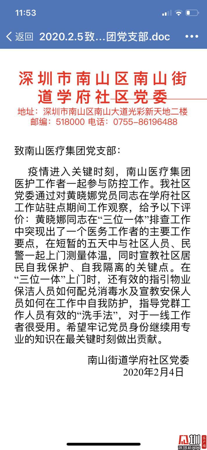 南山區(qū)南山街道學(xué)府社區(qū)黨委對黃曉娜的表揚(yáng)信