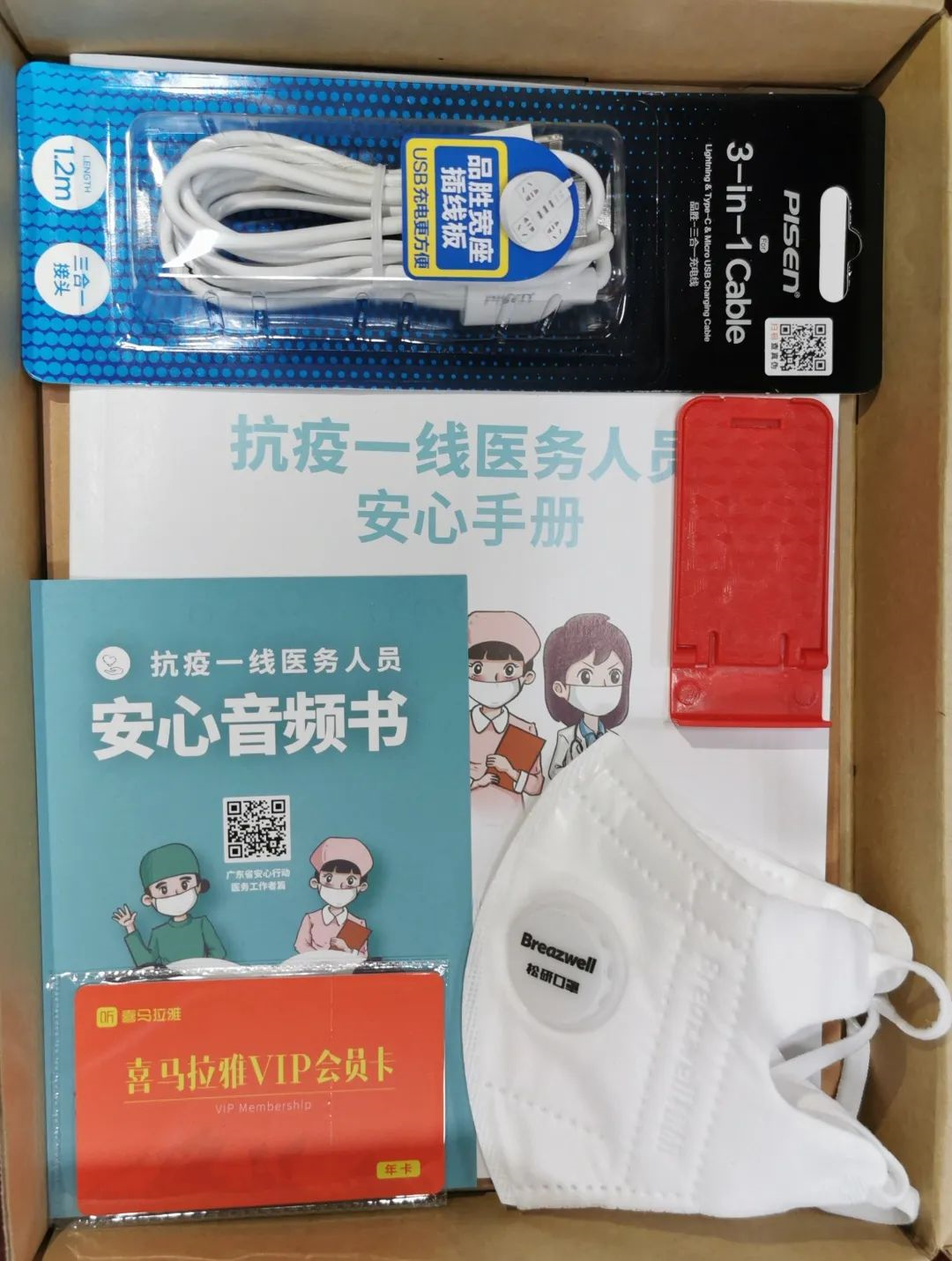 這是一個(gè)20x28cm2的普通牛皮紙紙盒,里面最顯眼的,是一本《安心手冊(cè)》,一張“抗疫一線醫(yī)務(wù)人員安心音頻書(shū)”卡,一張音頻APP的有聲書(shū)卡,和兩個(gè)N95口罩。此外,筆記本、筆、手機(jī)充電線、手機(jī)支架,也都細(xì)心地配全了。紙盒旁還放著一個(gè)小巧玲瓏的智能聲控音箱,使用者“不沾手”就能使用,防止病毒傳播。小東西里,也藏著大關(guān)愛(ài)。