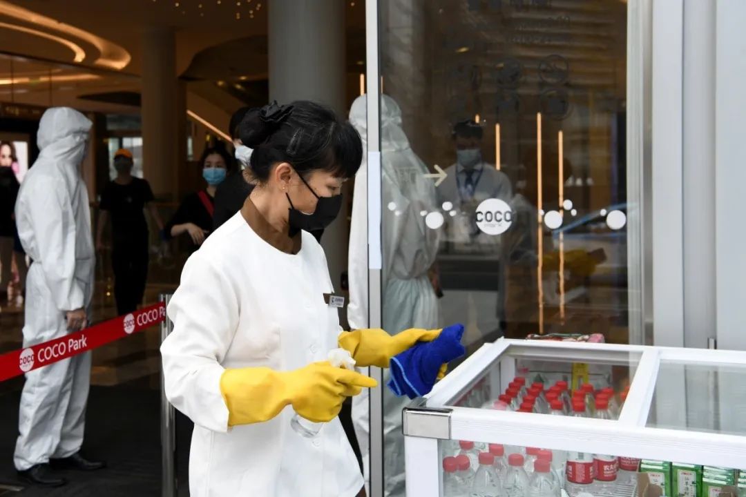 2月29日,商場保潔人員對“無人冰柜”進(jìn)行清潔和消毒。