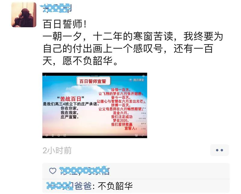 “生于非典,考于新冠,2020,我們注定不凡!疫情當前,雖然我們隔離在家,不能像往屆那樣,齊聚學校體育館舉行誓師大會,意氣風發(fā)地走進學校精心準備的“成功門”,伴隨奮進的樂聲高喊出我們的誓言,在“簽名紀念墻”上寫下對未來的期盼。但即使相隔網(wǎng)絡兩端,我們依然有老師祝福和引導,有家長的鼓勵和支持,有同窗的幫助和陪伴,高考百日,我們?nèi)栽谝黄鹫癖鄹吆簦?020高考,我們準備好了。”