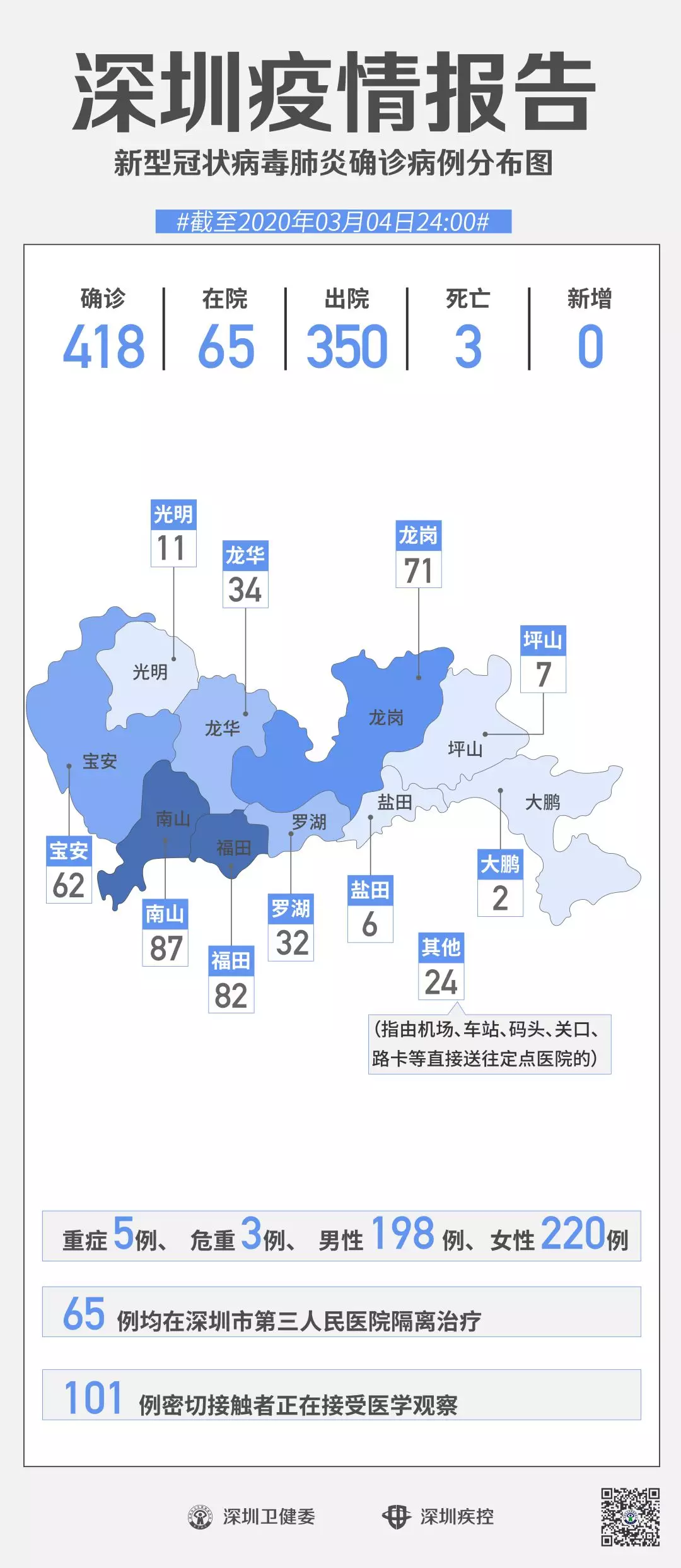 按照病例管理地區(qū)劃分,南山區(qū)87例、福田區(qū)82例、龍崗區(qū)71例、寶安區(qū)62例、龍華區(qū)34例、羅湖區(qū)32例、光明區(qū)11例、坪山區(qū)7例、鹽田區(qū)6例、大鵬新區(qū)2例、其他(指由機(jī)場(chǎng)、車站、碼頭、關(guān)口、路卡等直接送往定點(diǎn)醫(yī)院的)24例。
