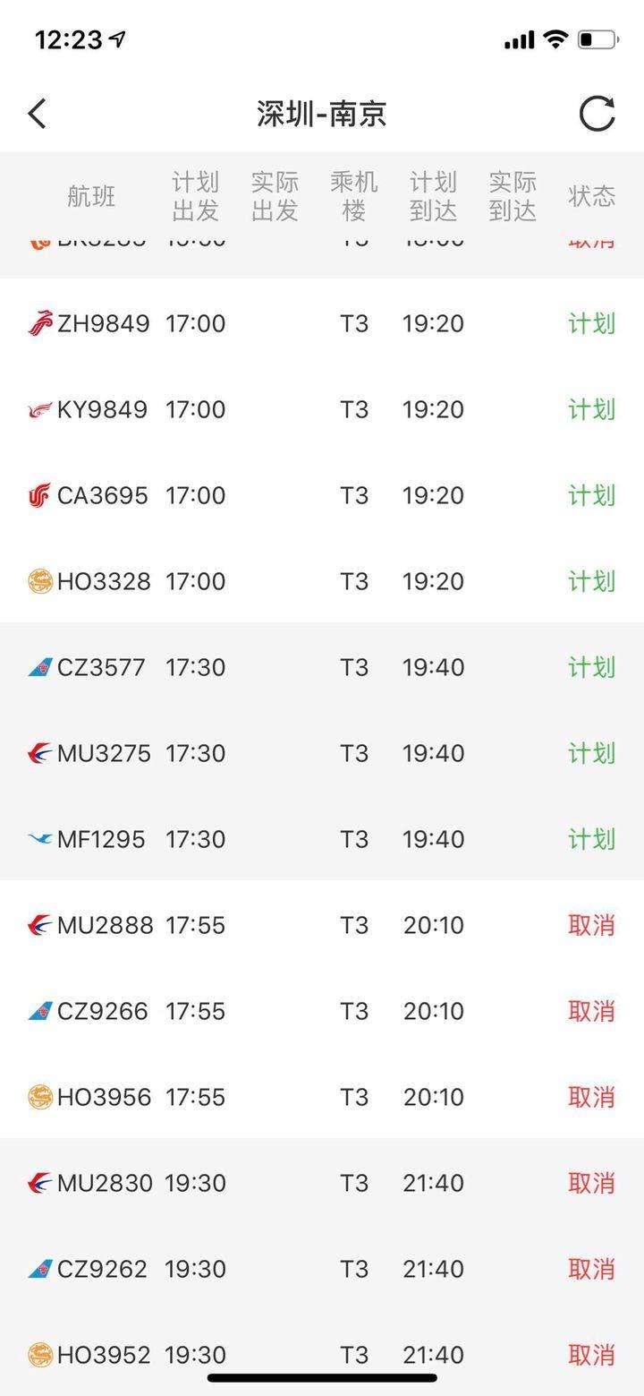 不僅是深圳飛往杭州的CA1736航班,記者發(fā)現(xiàn),今晚深圳飛往北京、上海、南京等國內(nèi)多個(gè)城市的航班,均顯示為取消狀態(tài)。而原計(jì)劃17:45由深圳飛往杭州的CA1734和原計(jì)劃22:05由深圳飛往杭州的MF8384航班,均顯示為取消狀態(tài)。