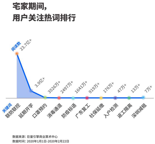 在1月1日至2月22日的頭條用戶閱讀數(shù)據(jù)中,聯(lián)防聯(lián)控、延期開學(xué)、口罩預(yù)約成為頭條平臺上最熱的關(guān)鍵詞前三位。此外、社保延繳、返工隔離等政府措施都被疫情下的手機(jī)用戶頻繁閱讀。