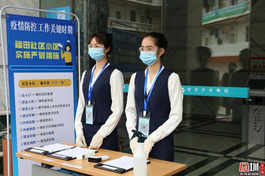 把好安全關(guān)。水務(wù)集團(tuán)工作人員正對出入萬德大廈的人進(jìn)行登記和體溫檢測。