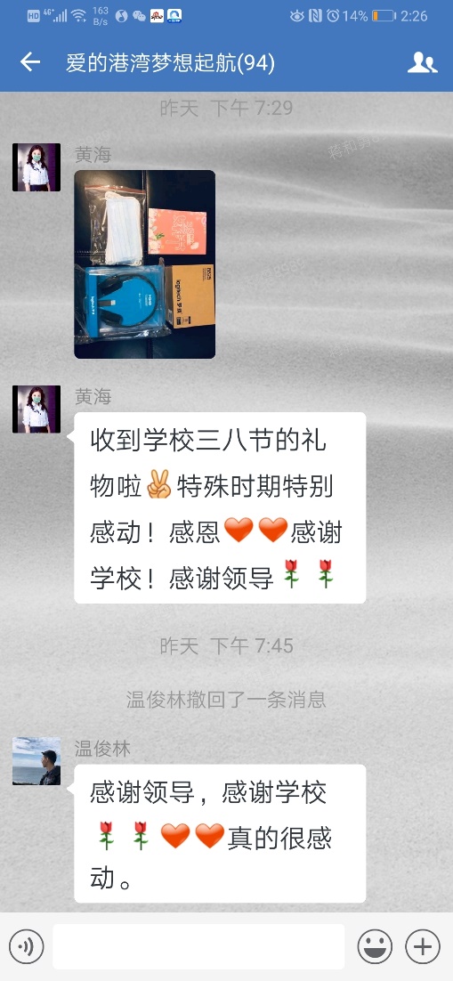 這一次,節(jié)日,校工會一致建議為繼續(xù)做好后續(xù)的“空中教學”,讓老師確保健康,為他們一并寄上一套口罩。疫情面前,口罩遮住了他們的面龐,卻遮不住眼中溫暖的笑意;手套隔離了病毒的威脅,卻不會將心靈間傳遞的溫情隔斷。