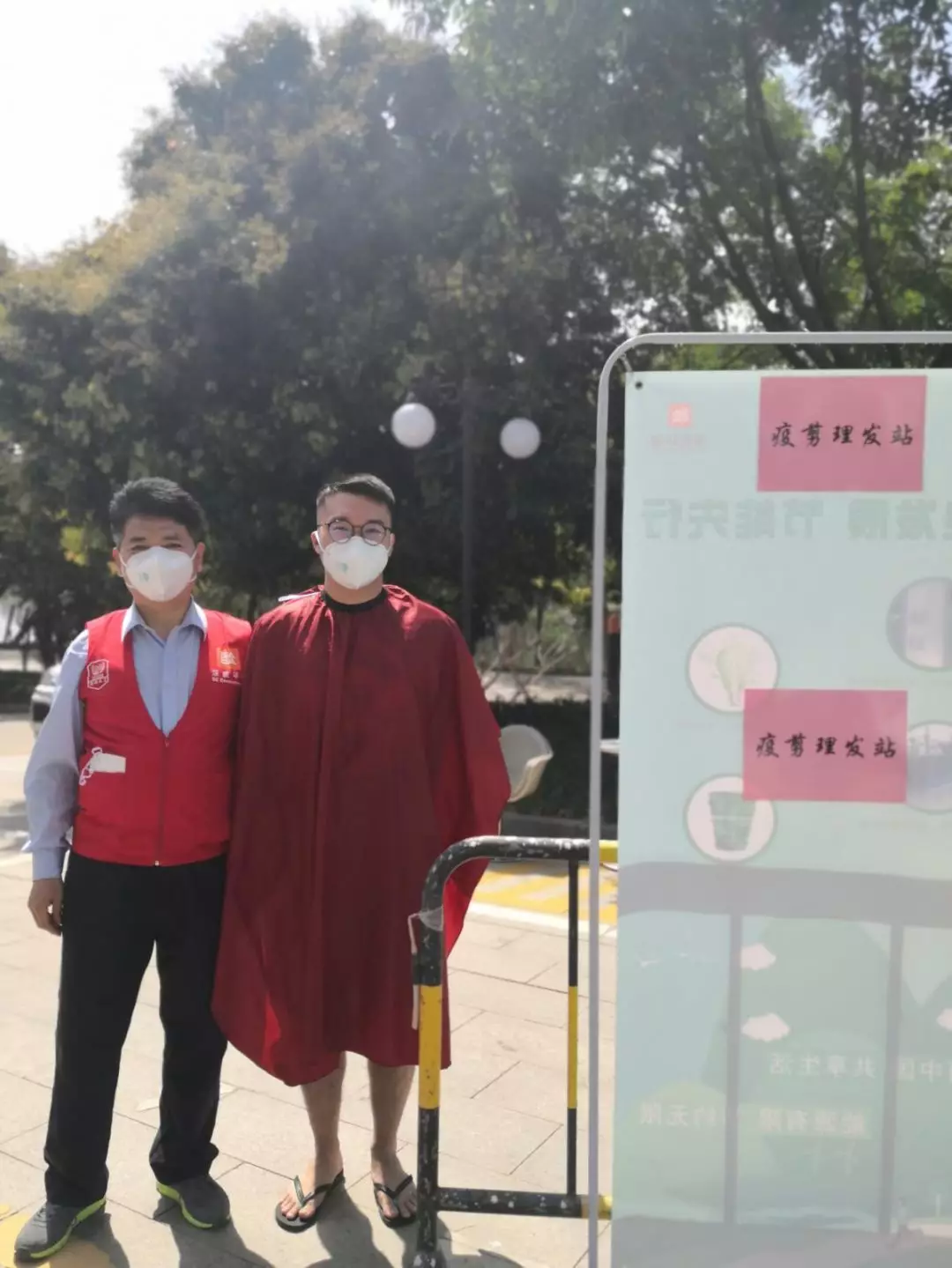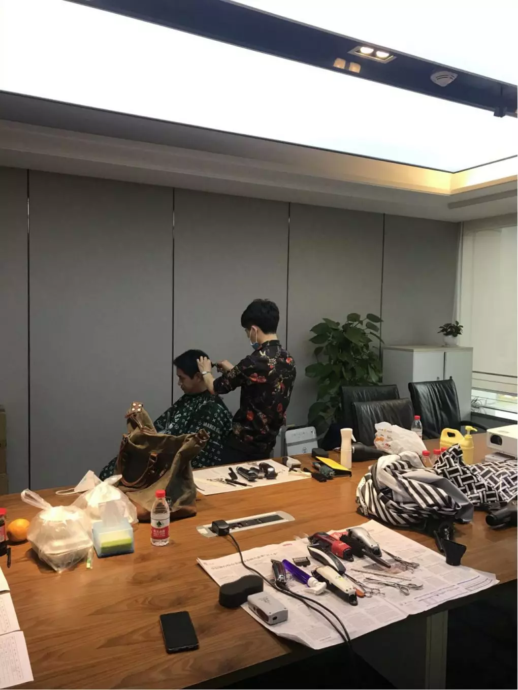 公司本部,1303會議室,臨時理發(fā)室“生意”也火爆極了。公司工會邀請了兩名專業(yè)的Tony老師,為近90名員工提供免費的理發(fā)服務(wù)。為減少人員聚集,理發(fā)采取提前線上預約,分時段進行,確保安全的同時,盡可能讓有需要的同事都能理上發(fā)。鋪上一次性地毯,坐上椅子,圍上一次性“斗篷”,Tony老師一頓熟練的剪發(fā)操作后,再用吹風機整好造型,就完成了理發(fā)的全過程。臨時理發(fā)師的搭建,有效解決了員工生活上的困難,幫助他們以良好的精神面貌投入工作來。